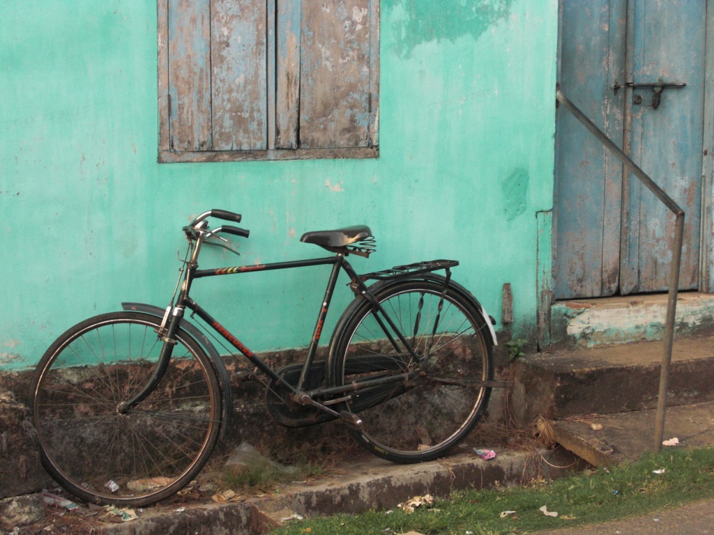 Obgleich ich Fahrrädern also durchaus emotional verbunden bin, war ich jahrelang blind für ihre Ästhetik. Erst vor drei Jahren während einer Reise durch Indien fiel sie mir das erste Mal mehr oder weniger zufällig ins Auge. Ich war mit zwei Freundinnen unterwegs und wir waren nach einer Zeit im Norden des Landes mittlerweile in Kerala angekommen. In der Mittagshitze liefen wir durch Fort Cochin, das einen seltsam morbiden Charme ausstrahlte mit seinen vernachlässigten Kolonialhäusern, an denen der Putz in Farben, die in ihrer Kraft an die Karibik erinnern, mit jedem Jahr mehr und mehr abblätterte. An einer schäbigen türkisfarben Wand eines unfassbar heruntergekommenen (aber immer noch bewohnten) Hauses lehnte ein Fahrrad, das um Längen zu teuer und modern schien, um hier hin zu passen. Fasziniert von dem Kontrast machte ich einen schnellen Schnappschuss. Ich hatte auf dieser Reise schon so viele kleine Kuriositäten auf den Chip meiner Kamera gebannt, dass ich das Bild im ersten Moment nur für eine weitere Ergänzung dieser Sammlung hielt.