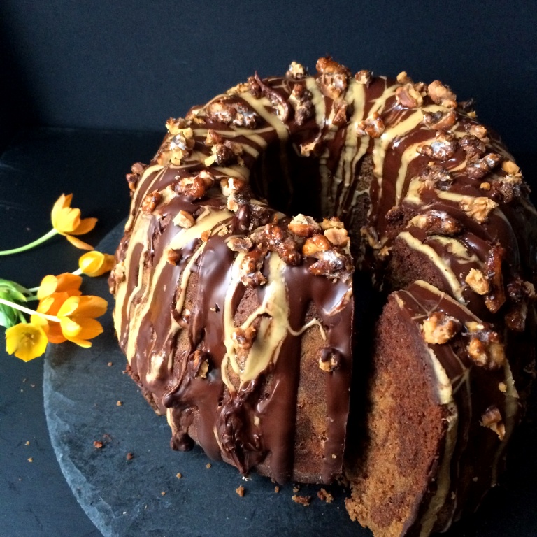 Marmorierter Schoko-Kaffee-Gugelhupf mit karamellisierten Walnüssen