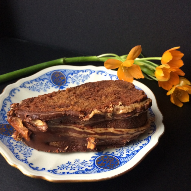 Sobald der Kuchen im Ofen ist, Nüsse grob hacken und den Zucker in einer Pfanne mit schwerem Boden schmelzen, bis er flüssig und hellgelb-klar ist. Die gehackten Nüsse zugeben und verrühren, bis sie komplett von Zucker überzogen sind. Auf einem mit Backpapier ausgelegten Backblech verteilen und zum Kuchen in den Ofen geben. Ca. 15 Minuten oder bis die Nüsse leicht gebräunt sind im Ofen lassen.