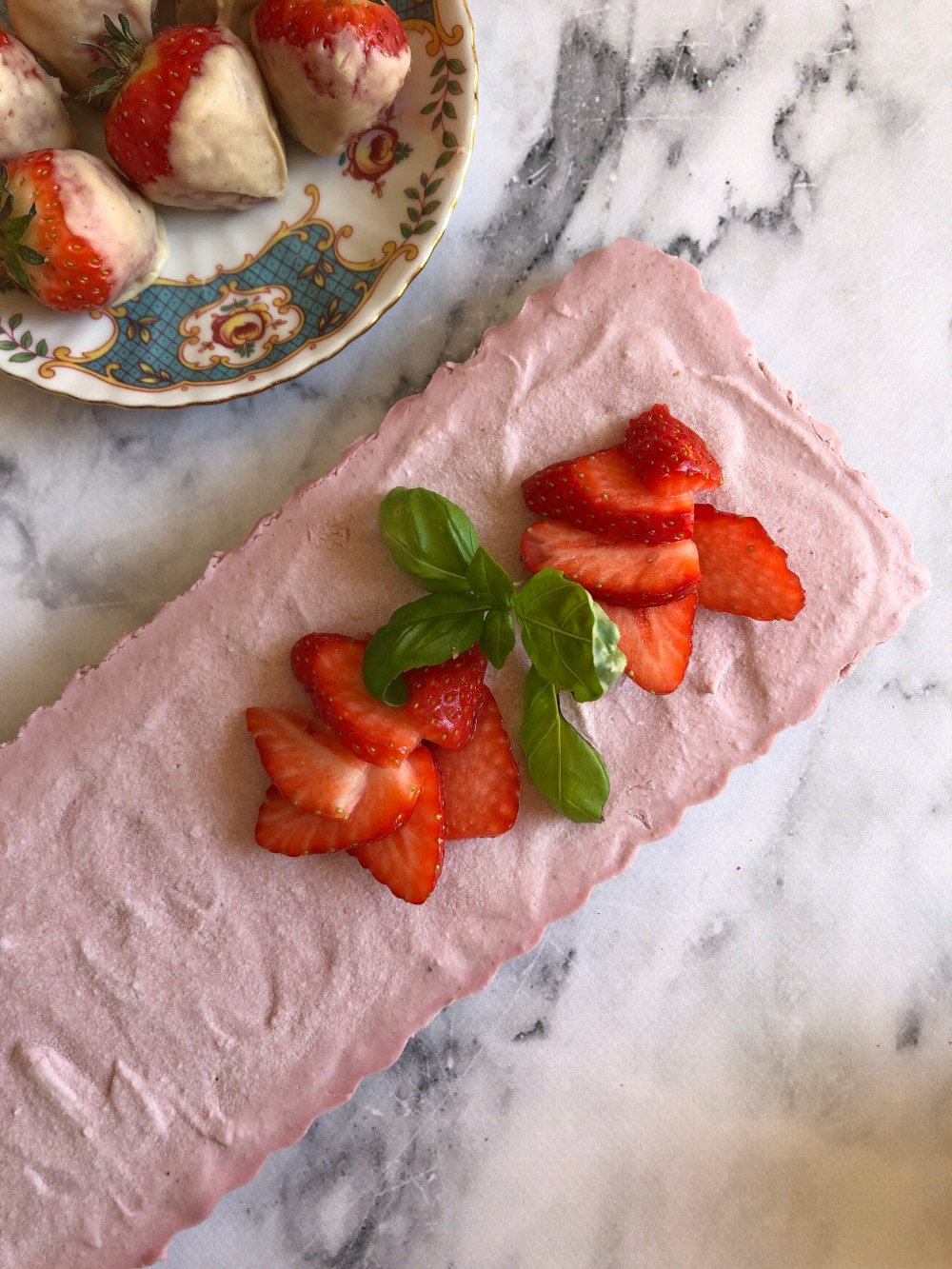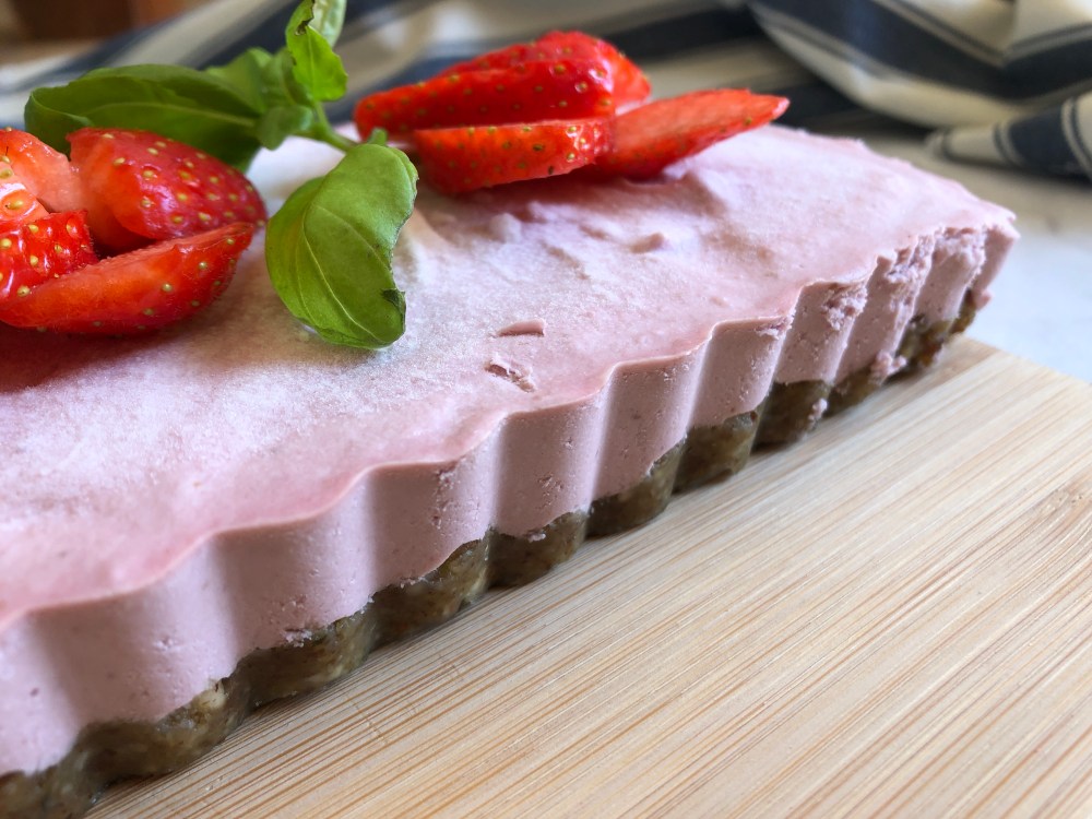 Beim Boden habe ich mich von einen Food Pairing-Klassiker inspirieren lassen: Erdbeeren und Basilikum! Folglich finden sich hier neben Nüssen und Datteln einige fein gehackte grüne Blättchen wieder, die durch ihre kräuterige Süße schön mit den fruchtigen Cheesecake-Creme harmonieren. Wem das hier alles zu verrückt klingt, der kann das Basilikum aber auch einfach weglassen.