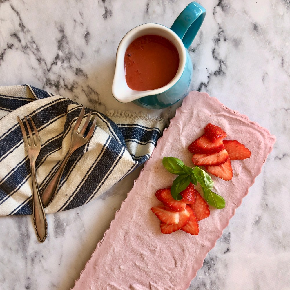 Zum Servieren den Kuchen etwa eine halbe Stunde vorher aus dem Gefrierfach holen und im Kühlschrank leicht antauen lassen. In Stücke schneiden und mit Erdbeer- oder Himbeersauce anrichten.