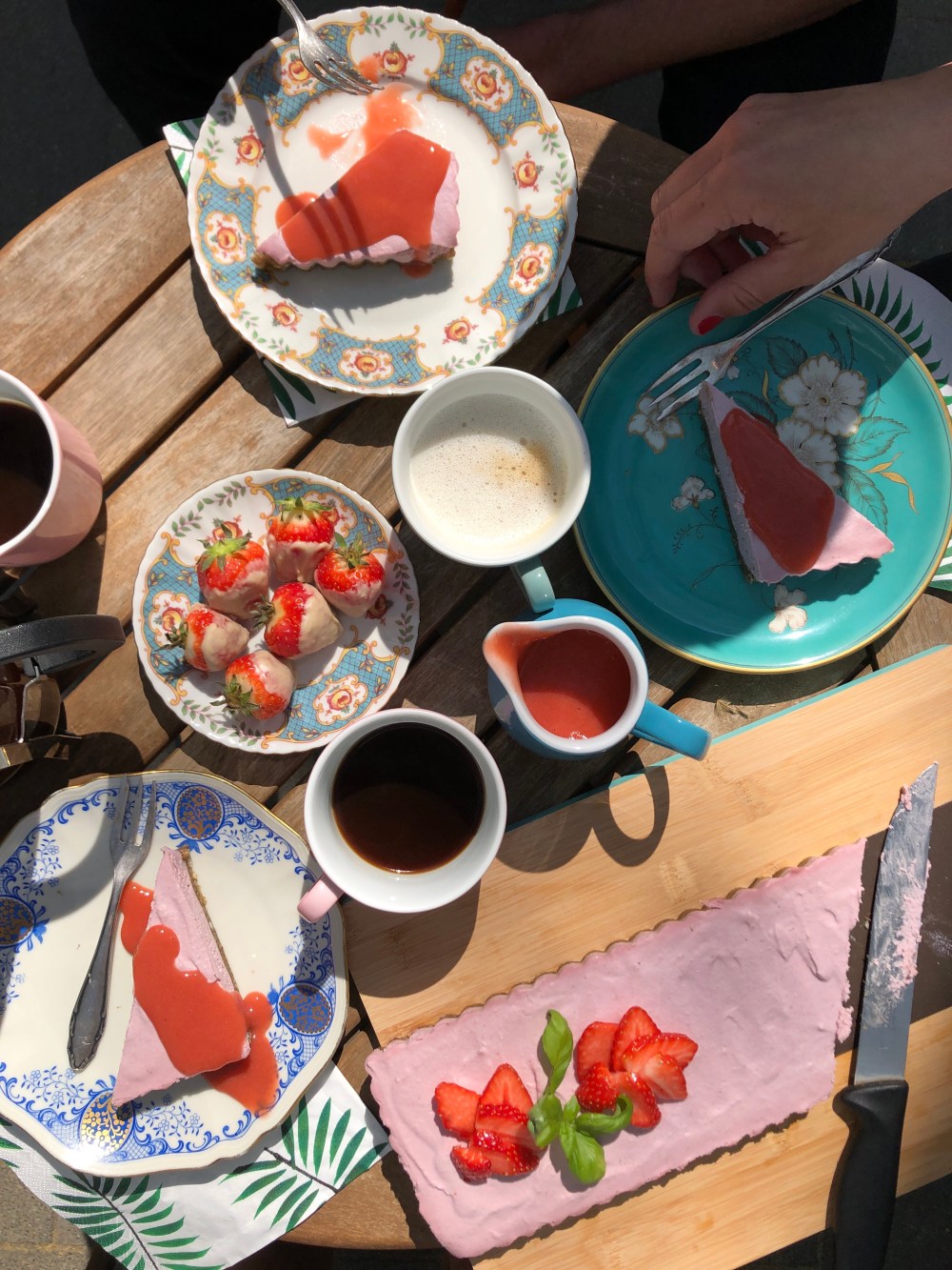 Das ultimative Finish für den Kuchen ist eine kalt gerührte Beerensauce (nach Belieben entweder aus Erdbeeren oder Himbeeren), die dem Ganzen nochmal einen perfekt fruchtigen Kick gibt, und auf die ihr nicht verzichten solltet!